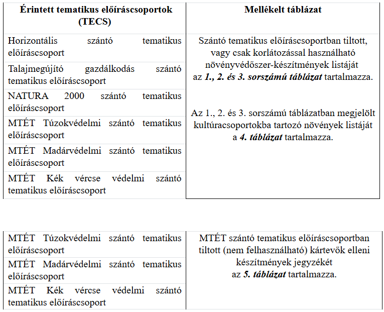 Felhívjuk a figyelmet, hogy azon AKG-ban támogatott területek esetében, ahol egyéb vállalás, vagy előírás miatt a növényvédőszer használata nem engedélyezett, úgy a közlemény mellékletében megjelölt korlátozással használható növényvédőszer készítmények használata sem megengedett! Például: Zöldugar és méhlegelő tábla vagy szegély esetén tilos növényvédőszer alkalmazása [Felhívás 3.2.1.1. fejezet 7) bekezdés a) pont és 9) bekezdés a) pont]